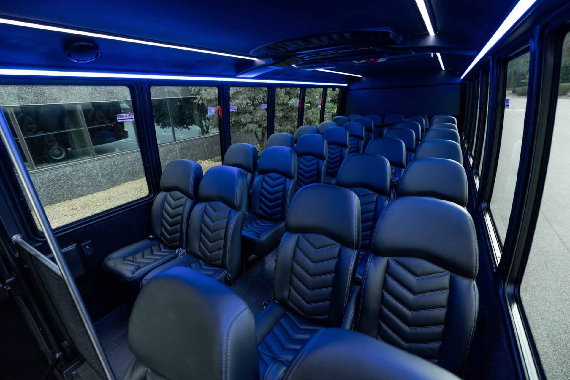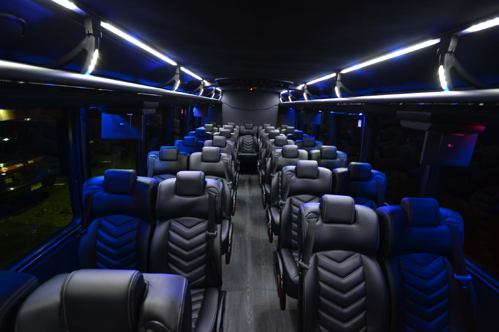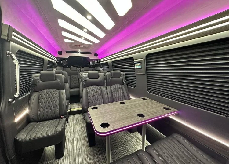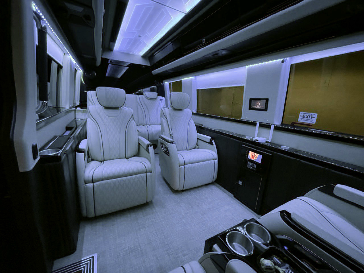 Our largest vehicle, the Luxury Motor Coach, seats up to 55 passengers with reclining seats, a restroom, WiFi, and an entertainment system. For mid-size groups, our Executive Mini Coach seats 24 passengers. Our Sprinter vans accommodate 6 to 14 passengers depending on configuration.